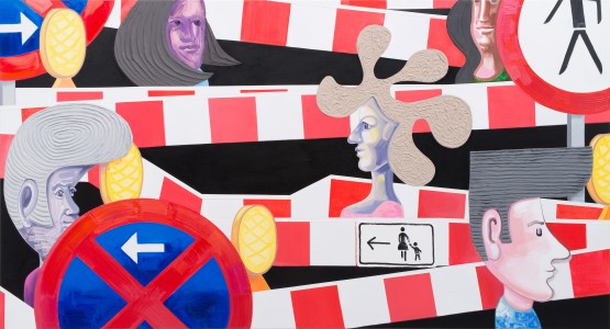 2016, Acryl, Öl, Papier, Modellierpaste auf Nessel, 130 x 240 cm